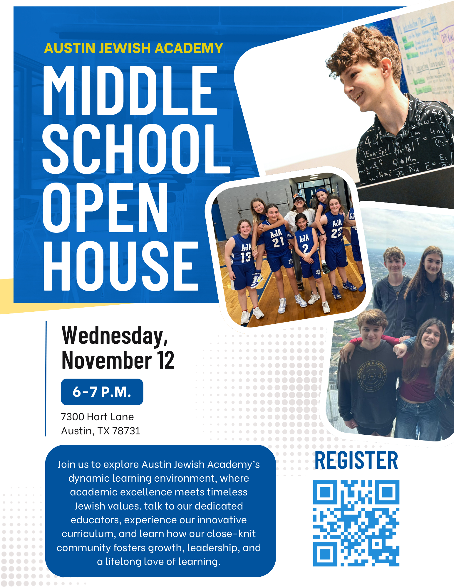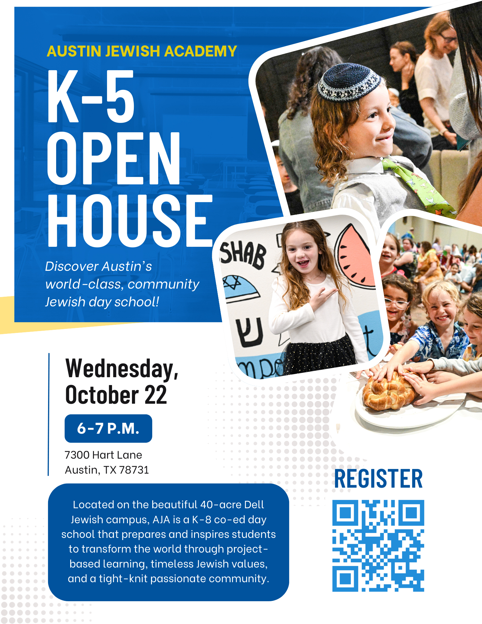 Thank you for your interest in Austin Jewish Academy where you can find the best of both worlds: a project-based academic curriculum with the highest of standards integrated with timeless Jewish values and traditions. We encourage you to visit our campus where you’ll find a supportive community of teachers and students collaborating on creative projects, exploring the world around them near and far, and thinking critically about ways to transform the future. We are an inclusive community of learners, with a faculty dedicated to inspiring a lifetime love of learning and to developing a meaningful connection to Jewish life past and present. At AJA, we empower students to reach their full potential both in the classroom and in the world at large.